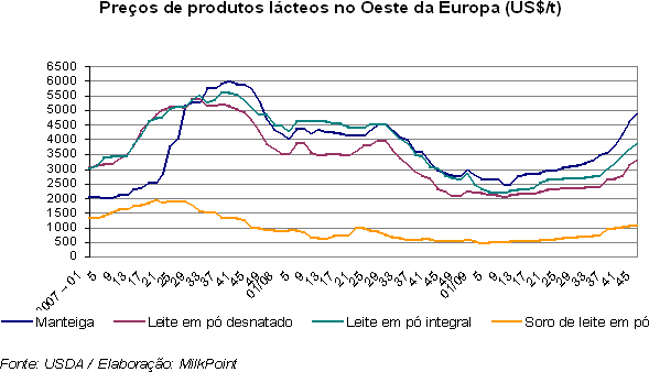 Segundo dados do Departamento de Agricultura dos Estados Unidos (USDA), os preços de exportação de lácteos, entre 02 e 13 de novembro, mostraram novo reajuste para todos os produtos na Oceania e no Oeste da Europa (com exceção do soro de leite, que teve redução de 1,16%), quando comparados à quinzena anterior. No Oeste da Europa, o preço médio do leite em pó integral foi cotado a US$ 3.862,5/ton (+4,4%), valor próximo a agosto de 2008 (US$ 3.875/ton). Na Oceania, o leite em pó integral mostrou reação expressiva (+11,1%), com preço médio de US$ 3.500/tonelada.