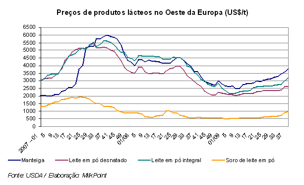 Segundo o boletim, a produção de leite em pó desnatado está maior em relação ao ano anteior, ficando o balanço do mercado dependente das exportações. Os preços do leite em pó desnatado estão mais estáveis. O aumento de preços no mercado mundial e a alta crescente no preço da gordura na UE têm elevado os preços do leite em pó integral, sendo que de agosto até agora houve aumento de 25%. Os preços dos queijos também estão subindo.