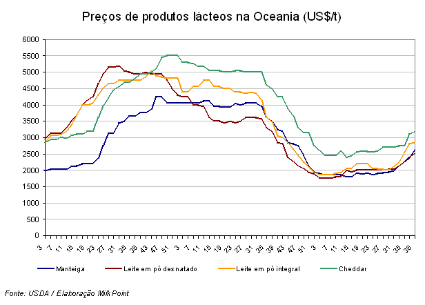 Segundo informações do Dairy Industry Newsletter (DIN), os estoques mundiais estão baixando e os preços estão subindo, reforçados pela desvalorização do dólar americano (US$). A Nova Zelândia teve um início lento de sua safra, com pouca oferta de leite spot, apesar de relatórios recentes já reportarem um aumento. Seca na Índia elevou os preços do óleo de manteiga, que estão puxando para cima os preços da manteiga. Com oferta restrita na NZ ou UE, os compradores estão pagando preços maiores pela manteiga dos EUA. Os preços de exportação dos queijos da NZ subiram acentuadamente, devido a um maior desvio de leite para produção de manteiga e leite em pó. O relatório de setembro da Australian Bureau of Agricultural and Resource Economics (ABARE), avalia que a produção de leite na Nova Zelândia não terá nenhum aumento na estação 2009-10 e que a oferta na Austrália será 2% inferior em relação à estação anterior. Os preços nos próximos meses dependerão da oferta na Austrália, Nova Zelândia e Ásia.