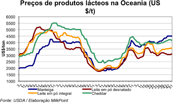 Na Oceania, o preço médio do leite em pó integral ficou em US$ 3.550/t, estável frente à quinzena anterior. O valor médio do leite em pó desnatado (US$ 3.100/ton), teve leve alta de 1,64%. O preço médio do queijo cheddar (US$ 4.150/t), teve leve recuo de 1,19%, e o da manteiga (US$ 4.500/t), permaneceu estável frente à última quinzena.