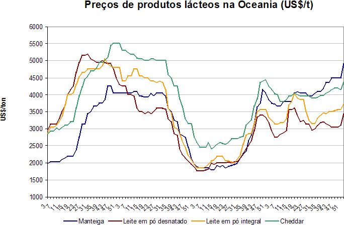 Na Oceania, o preço médio do leite em pó integral ficou em US$ 3.737,5/t, alta de 5,3% frente à quinzena anterior. O valor médio do leite em pó desnatado (US$ 3.425/ton), teve leve alta de 10,5% - a maior variação dentre os produtos exportados da Oceania. O preço médio do queijo cheddar (US$ 4.350/t) e o da manteiga (US$ 4.900/t), apresentaram valorização de 4,8% e 8,9%, respectivamente.