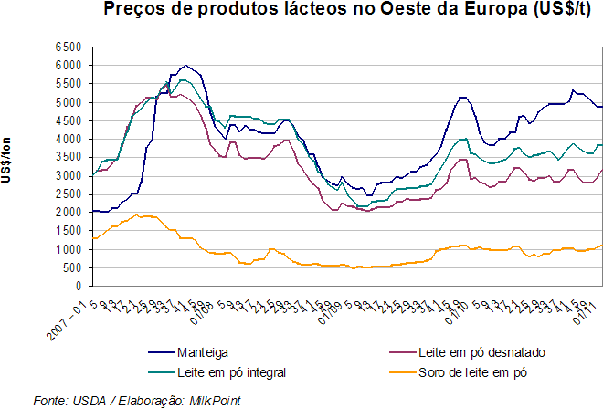 Gráfico 2. Evolução dos preços de exportação de lácteos do Oeste da Europa, em dólares por tonelada.