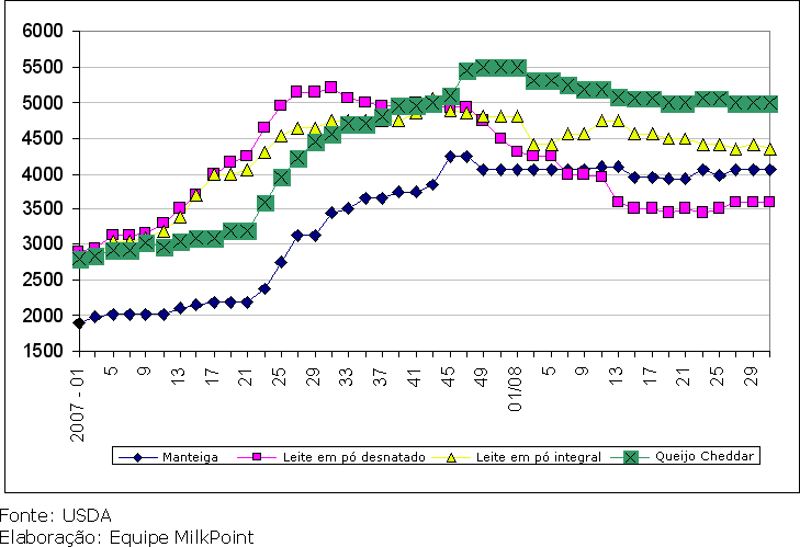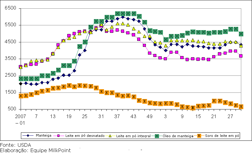 Gráfico 1. Evolução dos preços de exportação de lácteos do Oeste da Europa, em dólares por tonelada.