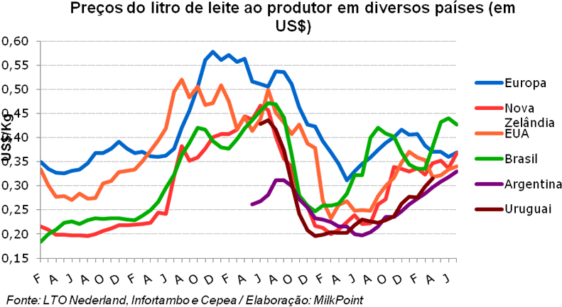 Na Europa, os maiores preços foram praticados na Itália, com a Granarolo pagando 0,3398 euros por quilo (US$ 0,4270/kg), em média.