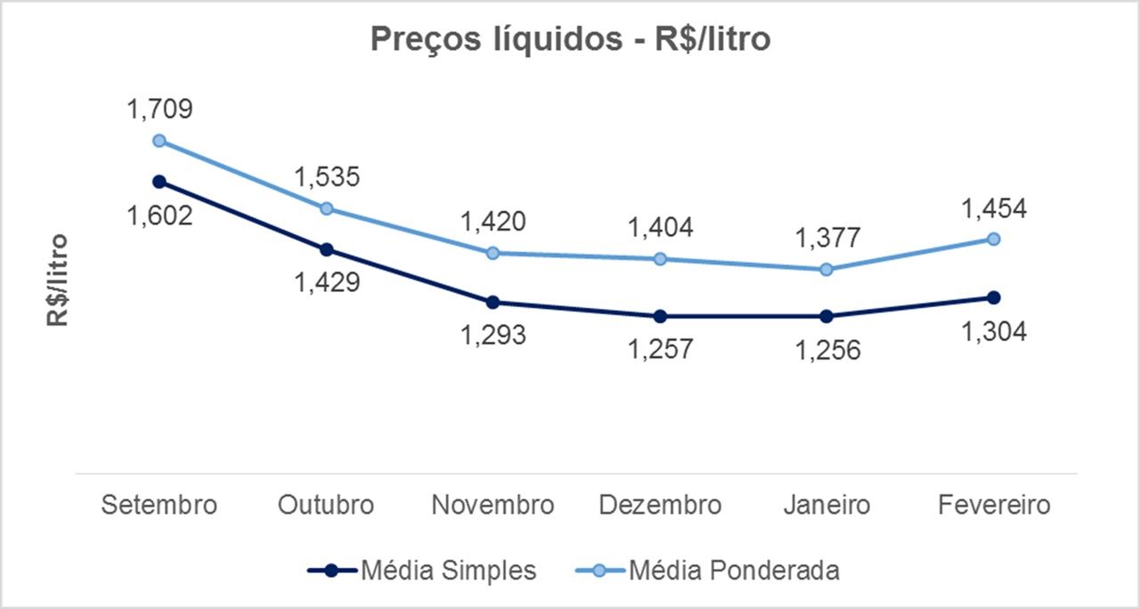 O gráfico 1 mostra a evolução dos indicadores de preços, de setembro a fevereiro. O indicador de preços líquidos em média simples (média do preço pago a cada produtor, sem considerar o volume dos produtores) terminou o mês em R$ 1,303/litro, aumento de cerca de 5 centavos em relação ao valor monitorado no mês anterior. O preço médio ponderado pelo volume, por sua vez, fechou em R$ 1,443/litro, cerca de 4 centavos a mais do que o valor divulgado em janeiro.
