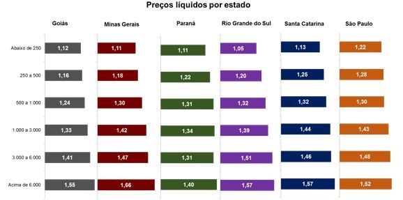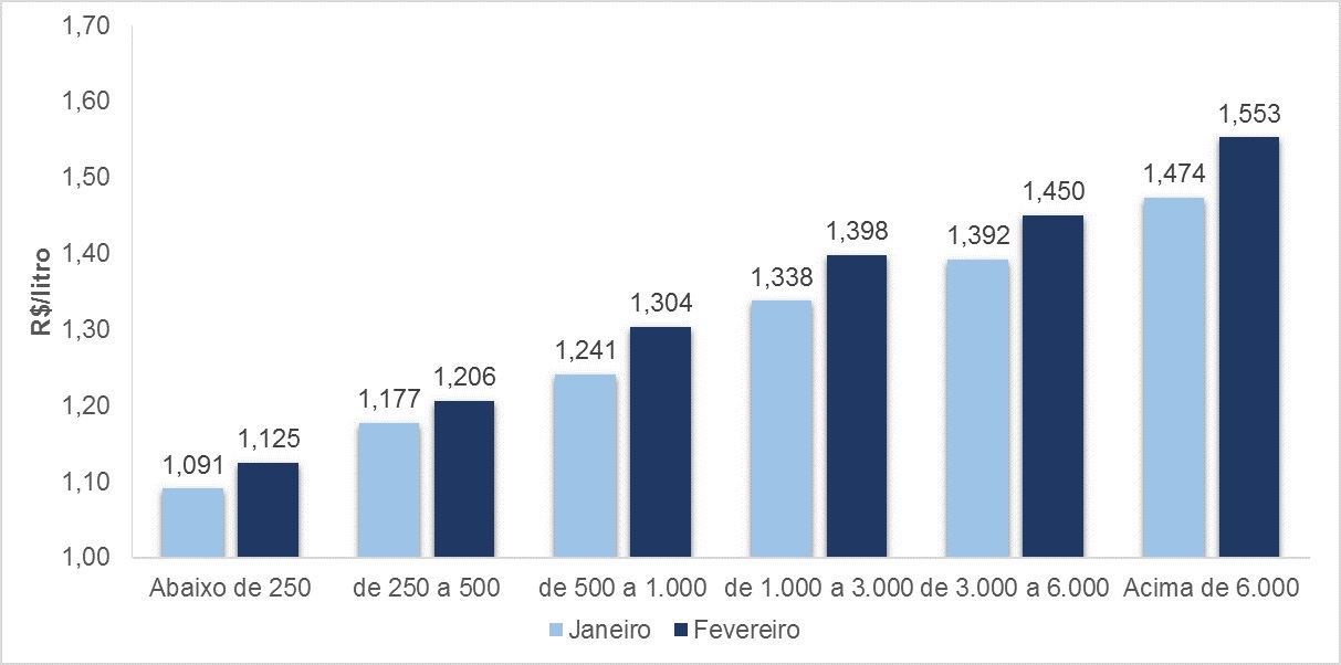 Além disso, os dados de fevereiro apontam para a alta no preço líquido em todas as faixas de produção. A maior alta nos preços pode ser vista pelos produtores com produção acima de 6.000 litros/dia, com aumento de 8 centavos em relação ao mês anterior. Além disso, as duas primeiras categorias (produtores abaixo de 250 litros/dia e de 250 a 500 litros/dia) apontaram alta de 3 centavos e, as demais categorias, apontaram alta de 6 centavos em média. Convém ressaltar ainda, que os produtores acima de 6.000 litros receberam em média 43 centavos a mais do que os produtores abaixo de 250 litros/dia. O gráfico 2 mostra os preços líquidos por média de volume de leite.