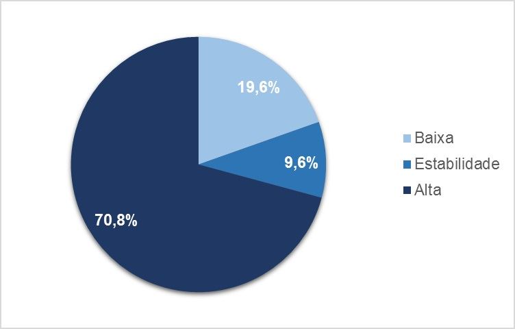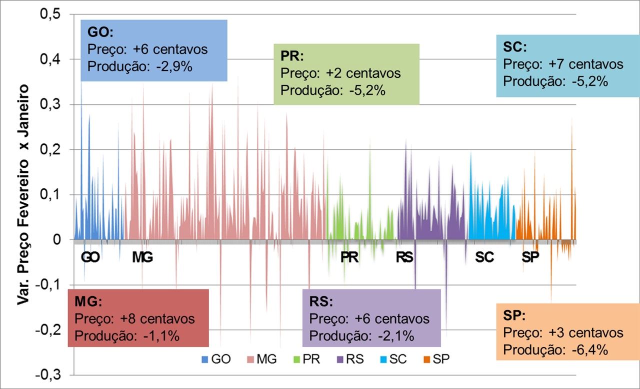 O cenário de alta foi a realidade de grande parte dos produtores que participam do sistema: entre os usuários que inseriram os dados tanto de janeiro quanto de fevereiro, 70,8% apontaram altas nos preços enquanto 9,6% declararam estabilidade e 19,6% alta nos preços. Os motivos relatados pelos participantes que não apresentaram alta foram, principalmente, produtores com contratos em preços fixados em meses anteriores e o fato de que alguns laticínios acabaram pagando menos seus fornecedores pela diminuição das vendas de leite no período de férias escolares.