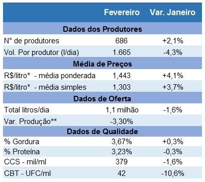 Neste mês, o sistema contou com 686 produtores de leite, um acréscimo de 2,1% sobre o mês passado. A média por produtor foi de 1.665 litros, volume 4,3% menor do que no mês anterior mas, ainda assim, muito acima da média nacional. O volume diário monitorado continuou próximo a 1,15 milhão de litros/dia, 1,6% mais baixo do que o valor monitorado em janeiro.