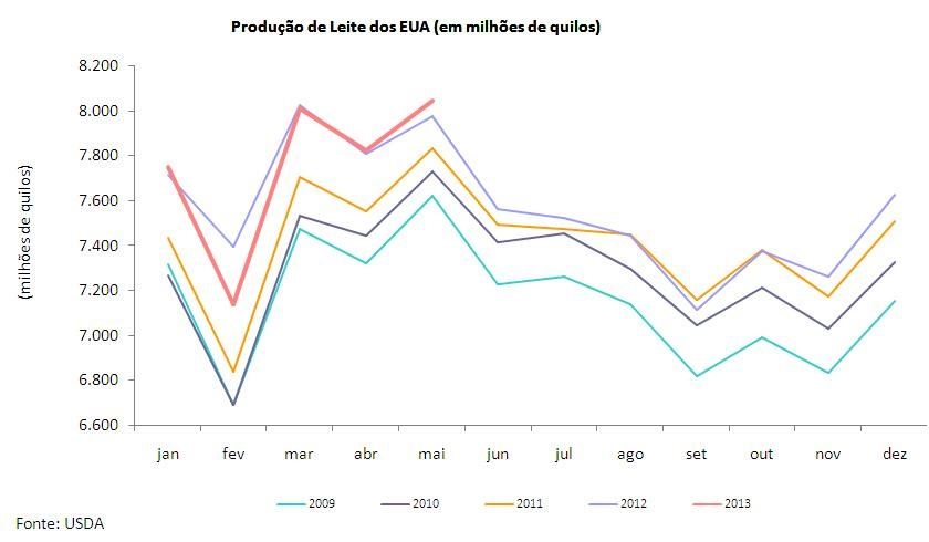 O clima mais frio que o normal em grande parte dos Estados Unidos no mês de maio parece ter beneficiado a produção de leite. De acordo com dados do Departamento de Agricultura dos Estados Unidos (USDA), a produção de leite nos 23 estados de maior produção aumentou em 0,9% em maio comparado com o mesmo mês do ano anterior, para 7,5 bilhões de quilos. Em todos os Estados Unidos, a produção aumentou em 0,8%.