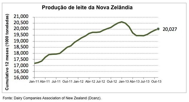 A produção cumulativa para os primeiros seis meses de 2013/14 (ano produtivo que vai de junho a novembro) aumentou em 5,6%. As previsões da Nova Zelândia para a produção total de leite em 2013/14 são de um aumento de 6,4% com relação a 2012/13, devido às excelentes condições de pastagens que continuaram até o pico estacional.