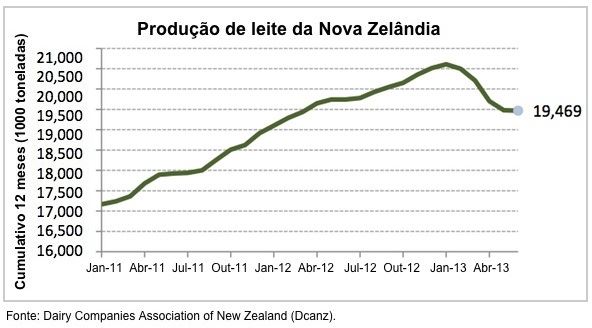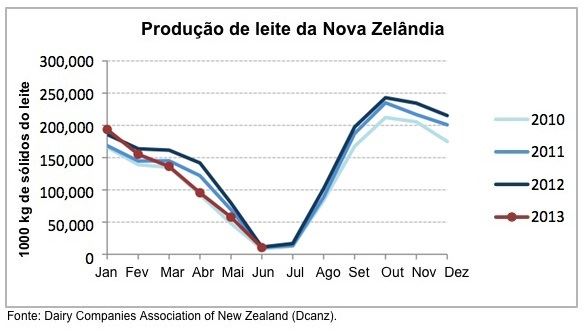 Dados da Fonterra indicam que os volumes de produção continuaram baixos durante o mês de julho. Recentemente, a Fonterra anunciou que, durante os meses de junho e julho, foram coletados 10,4% menos leite que nos mesmos meses de 2012. A captação de leite caiu mais na Ilha do Norte que na Ilha do Sul. Isso era esperado, uma vez que a produção de leite na Ilha do Sul está tipicamente crescendo mais rápido do que na Ilha do Norte, à medida que mais terras são convertidas para produção de leite. Além disso, a Ilha do Sul não foi tão impactada pela seca de 2012 quanto a Ilha do Norte.