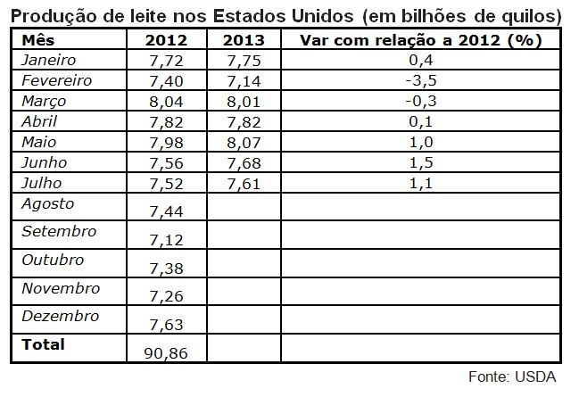 Apesar de a produção ter aumentado em 8,6 milhões de quilos nos primeiros sete meses do ano, a porcentagem do aumento foi quase imperceptível, sendo de apenas 0,07%. A produção de leite até agora nesse ano totalizou 54,08 bilhões de quilos.