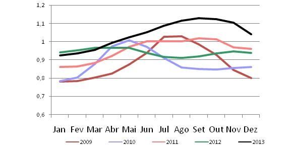 Os últimos dados do CEPEA/ESALQ indicaram queda de 5,4% na média de preços do litro de leite nacional. Aliado a isso, as informações referentes à captação da indústria divulgadas pelo IBGE mostraram um crescimento muito expressivo da oferta, tendo havido em setembro, último mês disponível, um crescimento de 13% na captação em relação a 2012. Em artigo publicado no MilkPoint (Montanha-russa no mercado de leite), esta pressão da oferta sobre os preços pagos ao produtor foi antecipada.