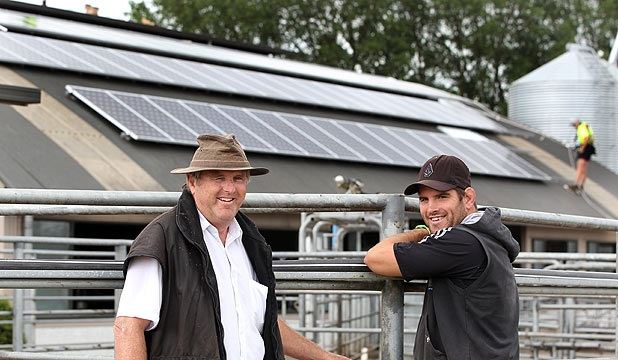 O produtor Hugh Chisholm e seu filho, Simon, com seus painéis solares instalados em sua fazenda leiteira. Foto de Peter Drury /Fairfax Media