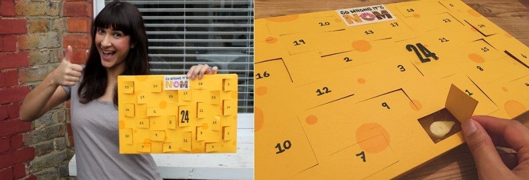 O protótipo incluía pedaços de cinco tipos de queijo, incluindo Gouda e Doux De Montagne. Por trás de cada janelinha, um queijo diferente.