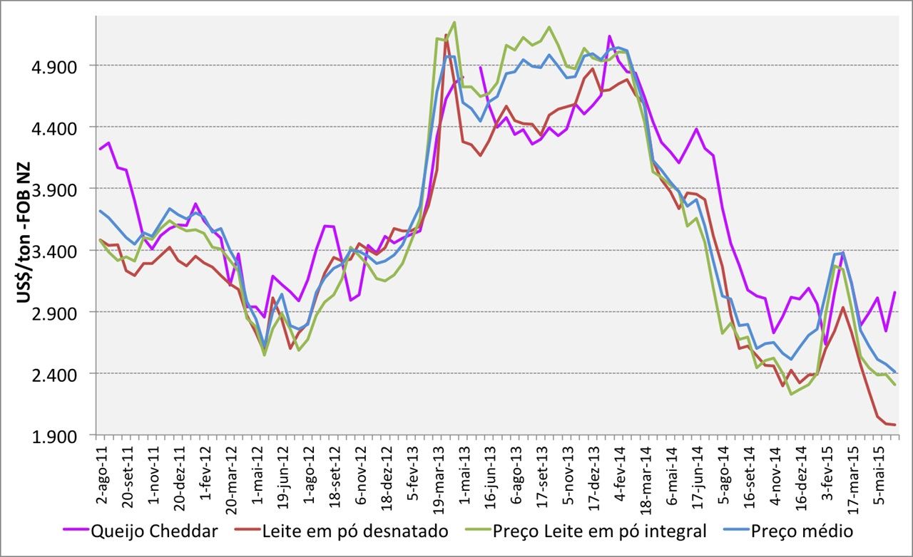 Nas projeções do Rabobank, considerando dados do Departamento de Agricultura dos EUA (USDA), os preços do leite em pó integral devem alcançar US$ 2.500 por tonelada no quarto trimestre de deste ano e US$ 2.900 no primeiro trimestre de 2016. No segundo trimestre deste ano, ficou em US$ 2.490, bem abaixo dos US$ 4.150 do mesmo intervalo de 2014.