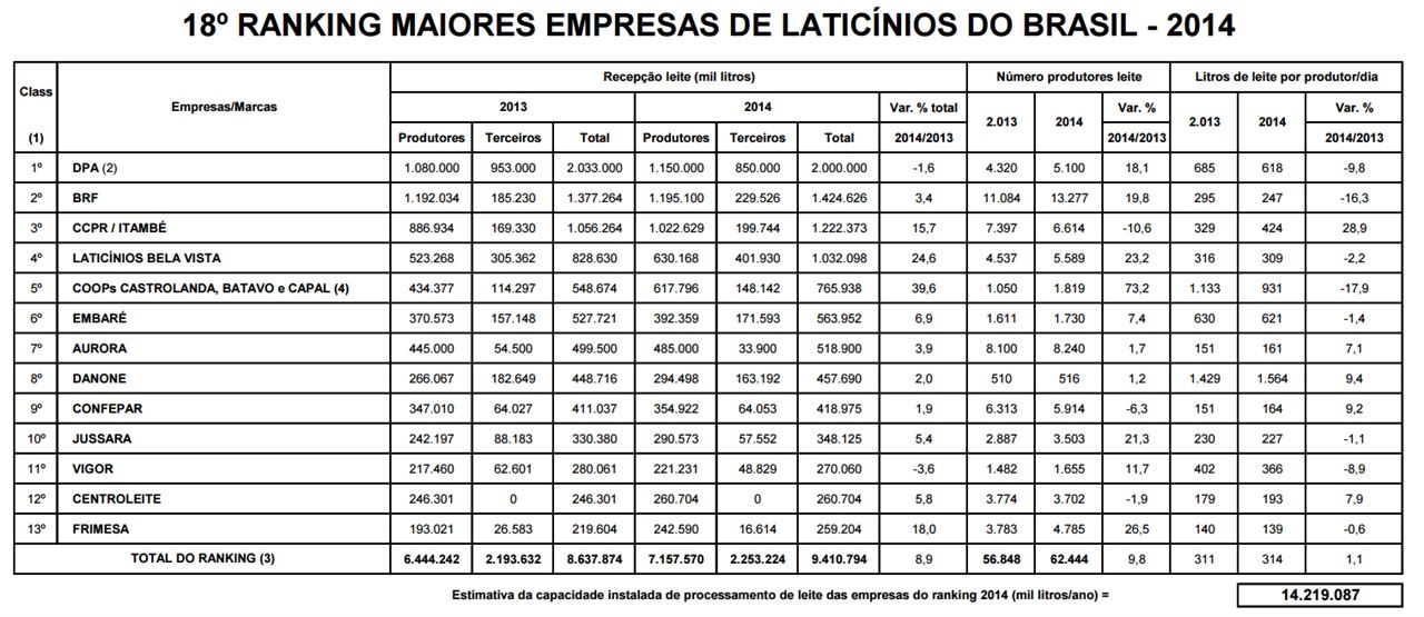 A estimativa da capacidade instalada de processamento de leite das empresas do ranking 2014 foi de 14.219.087 mil litros ao ano, ou seja, os 13 maiores laticínios do Brasil usaram cerca de 66% da sua capacidade. Em 2013, a capacidade utilizada foi de 70,6%, o que demonstra que houve maior ociosidade no ano passado.