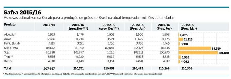 A safrinha nacional recorde esperada pela Conab será vital para garantir que a produção nacional de grãos também bata um novo recorde em 2016/17 . Ainda puxada pela soja, a colheita total passou a ser estimada pela autarquia em 210,3 milhões de toneladas, 1,3% mais que em 2014/15.
