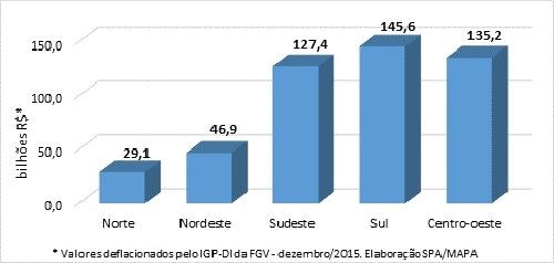 No ranking por regiões do VPB 2015, elaborado pela Coordenação-Geral de Estudos e Análises da SPA, o Centro-Oeste aparece em segundo lugar, com R$ 135,2 bilhões, seguido do Sudeste, com R$ 127,4 bi, Nordeste, com R$ 46,9 bi, e Norte, com R$ 29,1 bi.