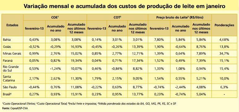Ao mesmo tempo, o óleo diesel, também muito utilizado nas operações de plantio e na colheita das silagens, foi reajustado no início de fevereiro – o grupo dos combustíveis foi o único que se tornou mais caro em todos os Estados da pesquisa, refletindo o reajuste autorizado pelo Governo federal. Os aumentos de preços da gasolina ficaram entre 2,87%, em Minas Gerais, e 5,39%, na Bahia, com a média em aproximadamente 5%. O diesel teve acréscimo médio de 1,94%. Como os reajustes do preço do leite não tiveram a mesma dimensão houve perda do poder de compra frente a esses insumos.