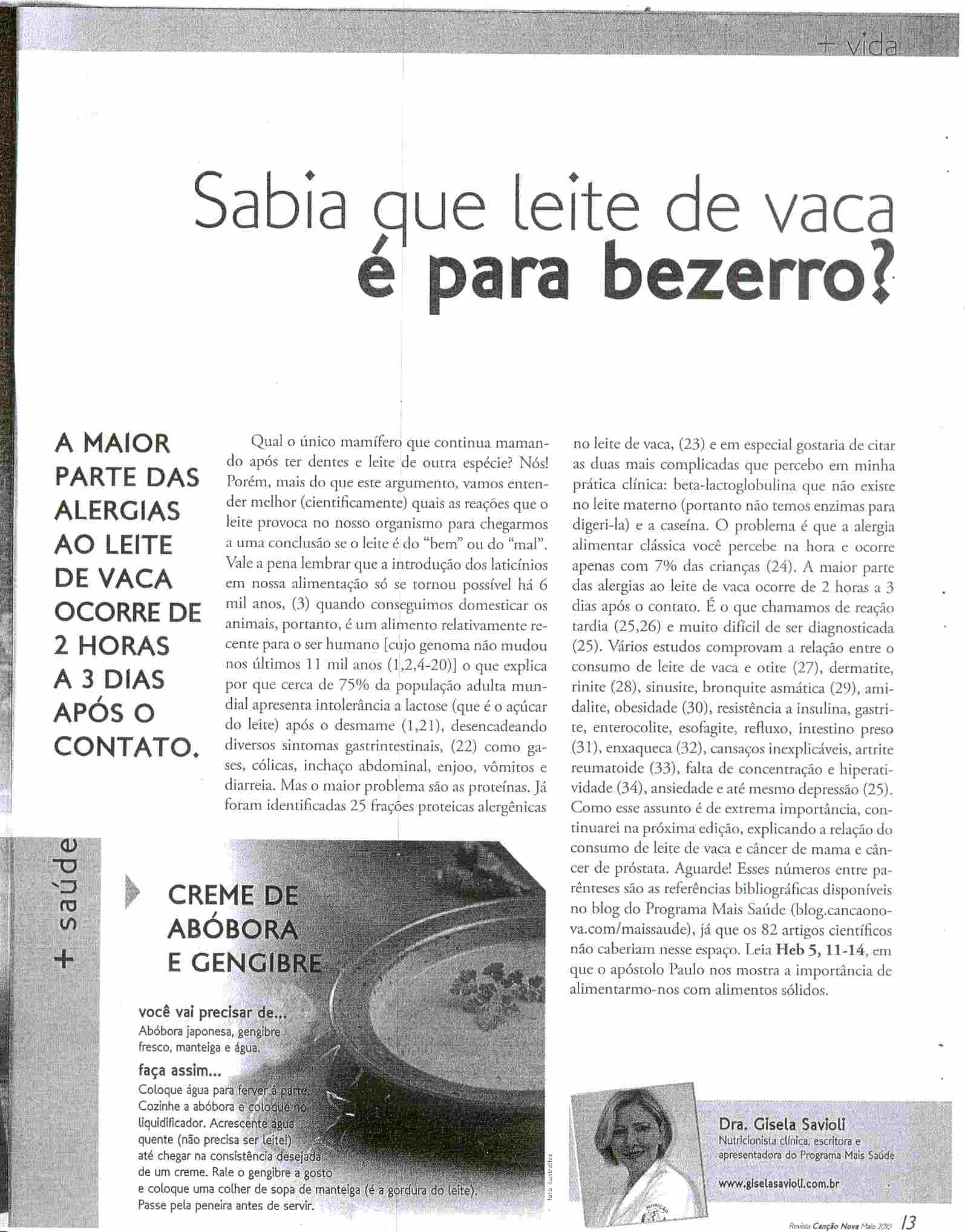 Basta se ir até uma banca de revistas e constatar-se-á o fato, com ressalvas a publicações sérias, uma vez que as mesmas existem. Virou mania brasileira criticar alimentação proveniente de animais, estamos construindo gerações de doentes, tendo em vista que a proteína animal é, para o ser humano, insubstituível. Mulheres do Brasil, NÃO SE ALIMENTEM DE LEITE E SEUS DERIVADOS, a conta lhes será apresentada quando chegar o climatério e posteriormente a menopausa. Ou estou errado ou é consenso médico de que o consumo de produtos lácteos previne osteoporose e outras doenças? Sabemos que percentualmente falando,em relação à nossa população, são insignificantes os casos de alergia à lactose, ao leite em si, menos ainda. Existem produtos lácteos especiais para esta ínfima parte da população. O progama leite pela vida, distribui leite em quase todos os municípios, aqui na minha região ninguém sofre de problemas de consumo de leite, eu particularmente, bebo do leite que produzo mais até do que recomenda o MS. mas conheço muita gente que por não consumir leite e seus derivados, carne de boi, de porco etc, adquiriram várias doenças. Não sou médico, mas de família de médicos, meu avô era diabético e tomava leite integral todos os dias, faleceu aos 94 anos. meu pai é médico e ele e minha mãe não abrem maõ do leite e seus derivados, meu pai tem 90 anos e minha mãe 86, ambos lúcidos e com ótima saúde. Muito interessante é a receita publicada junto ao artigo em questão, grávidas podem ingerir gengibre? e linhaça pode ficar de molho e ser tilizada no dia seguinte e a acidificação da linhaça? Não quero criar polêmica. mas bebo sim, MUITO LEITE e todo mundo deveria beber.