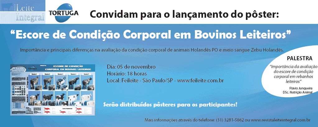 No dia 05 de novembro, às 18h, na Feileite (Centro de Exposições Imigrantes-SP), a Revista Leite Integral e a Tortuga farão o lançamento do pôster "Escore de Condição Corporal em Bovinos Leiteiros", mostrando a importância e as principais diferenças na avaliação da condição corporal de animais Holandês PO e meio sangue Zebu Holandês.