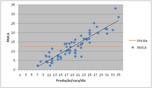 O R² (coeficiente de determinação) da regressão linear entre RMCA e Produção Diária, que é uma medida estatística utilizada para analisar o ajuste da série de dados ao modelo utilizado, foi de 0,79, o que indica que há grande correlação entre o crescimento da RMCA e a Produção Diária/vaca.