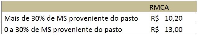 Pelos dados, é nítida a diferença entre o RMCA de cada faixa: enquanto as propriedades com até 30% de MS oriunda do pasto tiveram, em média, RMCA de R$13,00, a outra faixa, composta por propriedades com mais de 30% de MS proveniente do pasto obteve RMCA de R$10,20, diferença de 27,4%.