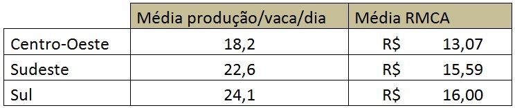 Tabela 2 - Média de produção/vaca/dia em litros e média RMCA em R$ por região.