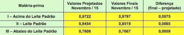 Tabela 2: Valores Projetados da Matéria-Prima (Leite) de Referência¹, em R$ – Dezembro de 2015.