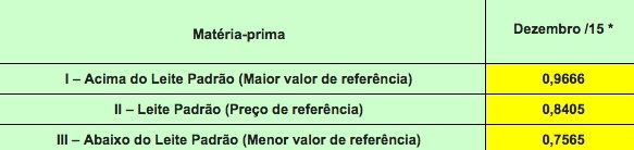 A Tabela 2 mostra os valores projetados para o preço de referência no mês de dezembro de 2015, tanto do preço de referência do leite padrão quanto dos preços de referência acima e abaixo do leite padrão.