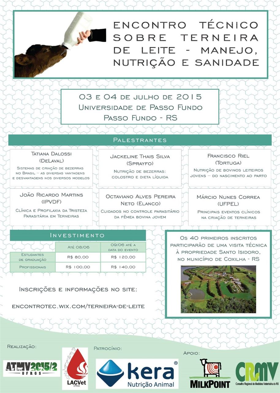 Deste modo, a ATMV 2015/2 e o LacVet UFRGS promovem o "Encontro Técnico sobre Terneira de Leite - Manejo, Nutrição e Sanidade" que será realizado dias 03 e 04 de julho de 2015 no Auditório do Hospital Veterinário da UPF (Universidade de Passo Fundo), RS e também contará com uma Visita Técnica na Fazenda Santo Isidoro no município de Coxilha, RS.