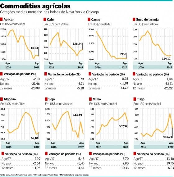 Na bolsa de Nova York, as principais "soft commodities" variaram menos, e todas (açúcar, café, cacau, suco e algodão) fecharam agosto com quedas tanto em relação às médias de dezembro quanto sobre as de agosto do ano passado.