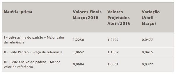A diretoria do Conseleite Santa Catarina reunida no dia 14 de abril de 2016 na cidade de Florianópolis, atendendo os dispositivos disciplinados no artigo 15 do seu Estatuto, inciso I, aprova e divulga os preços de referência da matéria-prima leite referentes ao mês de março de 2016 e a projeção dos preços de referência para o mês de abril de 2016.