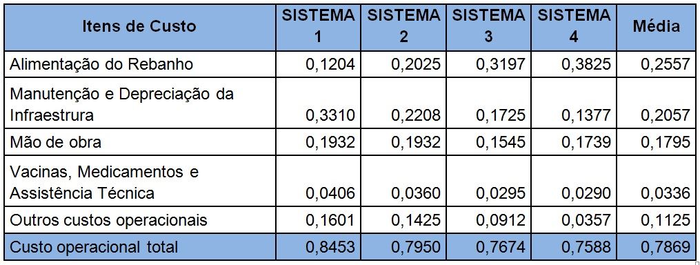 O resultado operacional da atividade leiteira, em Santa Catarina, continuou positivo em agosto de 2013. Na média o custo de produção de leite, em Santa Catarina, segundo a planilha de cálculo do Conseleite/SC, atualizada pelo Epagri-Cepa registrou um custo médio de R$0,7869, apresentando crescimento de 2,8% em relação ao custo médio de maio de 2013. A principal causa do aumento do custo médio se deve, principalmente, ao aumento de preço da ração comercial para vaca em lactação (7,0%) e a ração comercial para novilhas (12%).