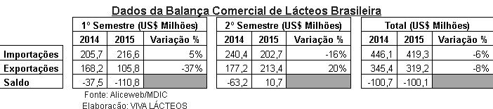 Segundo o Ministério do Desenvolvimento, Indústria e Comércio Exterior (MDIC), o Brasil exportou, em 2015, US$ 319 milhões e importou US$ 419 milhões. No entanto, ao avaliar por semestre, no primeiro o saldo foi de US$ 110 milhões negativos. Já na segunda parte do ano, o resultado foi positivo em US$ 10 milhões. Durante o ano passado, o Brasil embarcou 28 tipos de produtos lácteos para 45 diferentes destinos. A maior quantidade continua sendo comprada pela Venezuela, US$ 238 milhões em 2015, e o principal produto é o leite em pó integral, US$ 234 milhões.