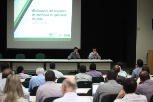 Os assessores Rodrigo Almeida e Bruno Leite, da Secretaria do Produtor Rural e Cooperativismo do Ministério da Agricultura, Pecuária e Abastecimento (Mapa), apresentaram aos participantes da reunião o modelo de projeto para a qualificação e capacitação da cadeia leiteira.