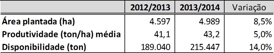 Tabela 01. Comparação entre 2012/2013 e 2013/2014 parao plantio de milho para silagem