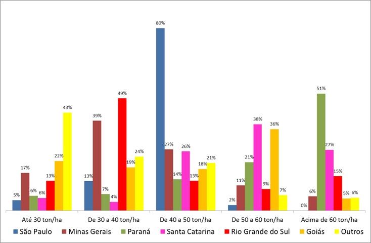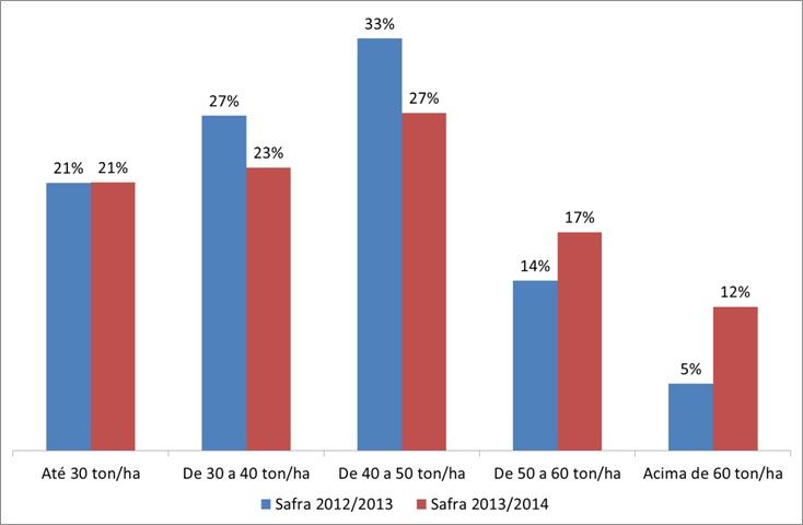 Ainda que a produtividade média tenha crescido 8,5% entre as duas safras, verificou-se uma considerável dispersão da produção média de Matéria Verde por hectare entre os produtores pesquisados. Como mostra o gráfico 01, para a safra 2013/2014, 44% dos produtores pesquisados produziram até 40 ton de Matéria Verde por hectare e apenas 12% dos respondentes atingiu números médios acima de 60 tons/hectare. De acordo com Alexandre Mendonça Pedroso, pesquisador da Embrapa Sudeste, produtividades “aceitáveis” deveriam ficar entre 45 e 50 ton/ha, sendo níveis considerados “bons” apenas aqueles iguais ou superiores a 60 ton/ha.