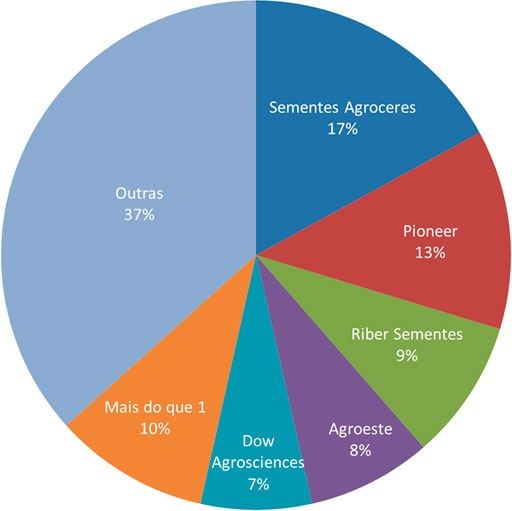 Com relação aos híbridos utilizados, dentre os 259 produtores, não há uma empresa fornecedora com participação dominante no fornecimento de sementes (gráfico 04). Ao contrário, cerca de 10% da amostra utiliza-se de híbridos fornecidos por mais de uma empresa.