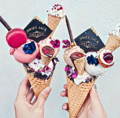 1. A especialidade da casa é esse gelatão cheio de estilo. O mais curioso é que ele vem decorado com vários cones menores, recheados com chocolate ao leite derretido. Você pode adicionar macarons, bolo e até pétalas de flores comestíveis.