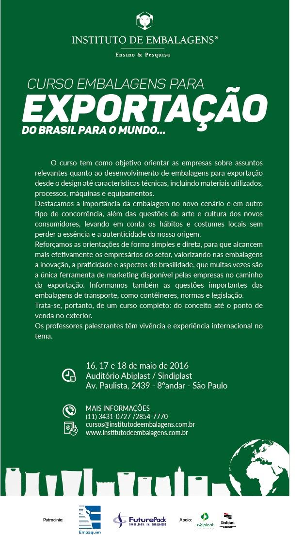 O curso tem como objetivo orientar as empresas sobre assuntos relevantes quanto ao desenvolvimento de embalagens para exportação desde o design até características técnicas, incluindo materiais utilizados, processos, máquinas e equipamentos. Destacamos a importância da embalagem no novo cenário e em outro tipo de concorrência, além das questões de arte e cultura dos novos consumidores, levando em conta os hábitos e costumes locais sem perder a essência e a autenticidade da nossa origem.