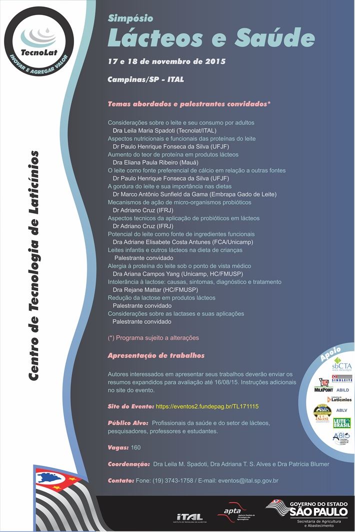 O Centro de Tecnologia de Laticínios do Instituto de Tecnologia de Alimentos - Tecnolat/ITAL, realizará, no período de 17 a 18 de novembro de 2015, em Campinas, São Paulo, o SIMPÓSIO LÁCTEOS E SAÚDE, cuja proposta é divulgar o conhecimento técnico científico relacionado ao consumo de lácteos para os setores da sociedade formadores de opinião e responsáveis pelo desenvolvimento da tecnologia de laticínios no país.[...]