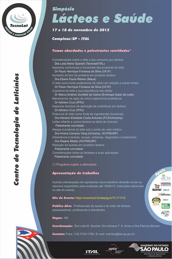 O Centro de Tecnologia de Laticínios do Instituto de Tecnologia de Alimentos- Tecnolat/ITAL, realizará, no período de 17 a 18 de novembro de 2015, em Campinas, São Paulo, o SIMPÓSIO LÁCTEOS E SAÚDE, cuja proposta é divulgar o conhecimento técnico científico relacionado ao consumo de lácteos para os setores da sociedade formadores de opinião e responsáveis pelo desenvolvimento da tecnologia de laticínios no país. O evento seguirá tendência do debate envolvendo ciência e tecnologia e buscará agregar a opinião de profissionais das áreas de saúde, que são também responsáveis pela transferência e aplicação desses conhecimentos para os clientes a quem prestam serviço.