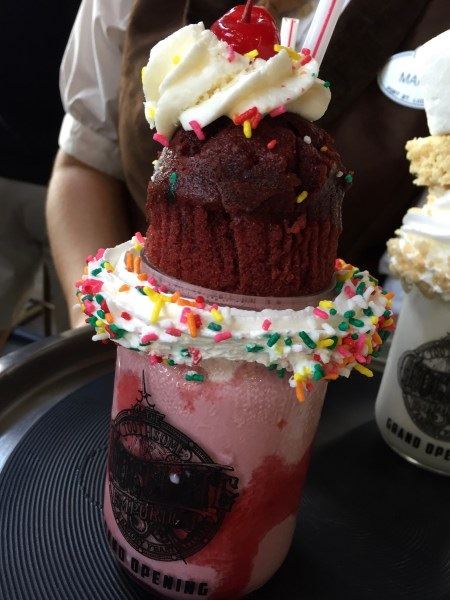 Red Velvet Milkshake: sorvete de baunilha, cupcake de red velvet, calda de framboesa, granulado colorido, chantilly e cereja. Preço: 12,50 dólares.