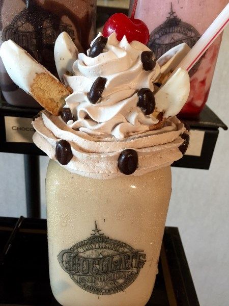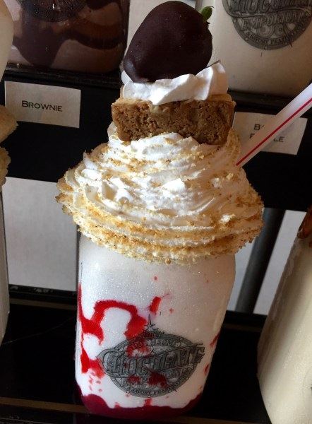 Chocolate x 5 Milkshake: sorvete de chocolate, pedaços de chocolates, morangos, calda de chocolate, chantilly, raspas de chocolate e cereja. Preço: 12,50 dólares.