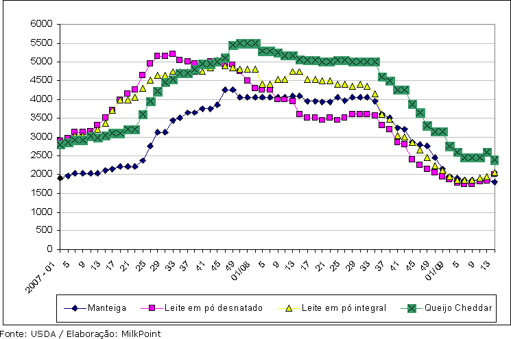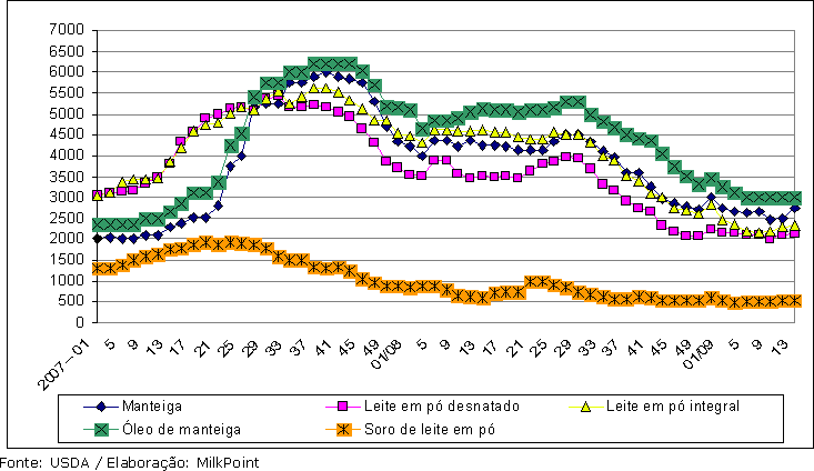 Gráfico 1. Evolução dos preços de exportação de lácteos do Oeste da Europa, em dólares por tonelada.