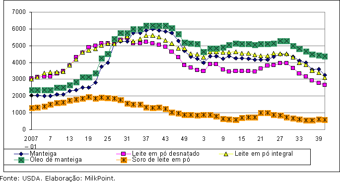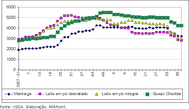 Gráfico 1. Evolução dos preços de exportação de lácteos do Oeste da Europa, em dólares por tonelada.