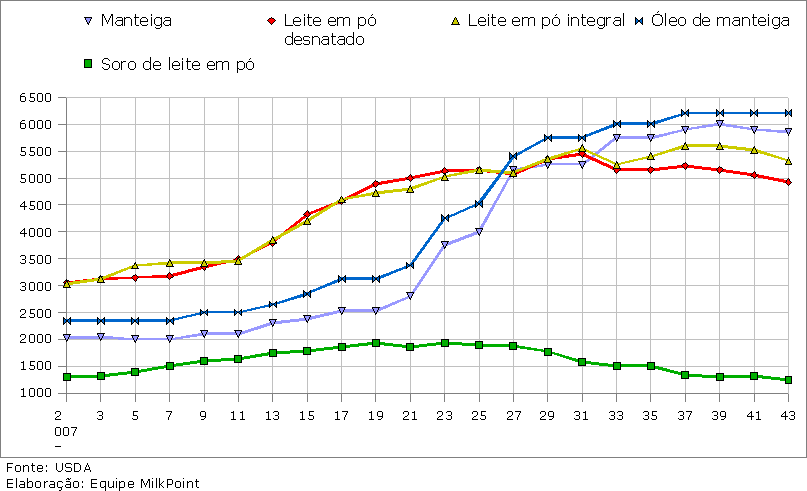 Apenas o óleo de manteiga ("butter oil") permaneceu estável em relação à quinzena anterior. O produto ficou entre US$ 5.900/t e US$ 6.500/t.