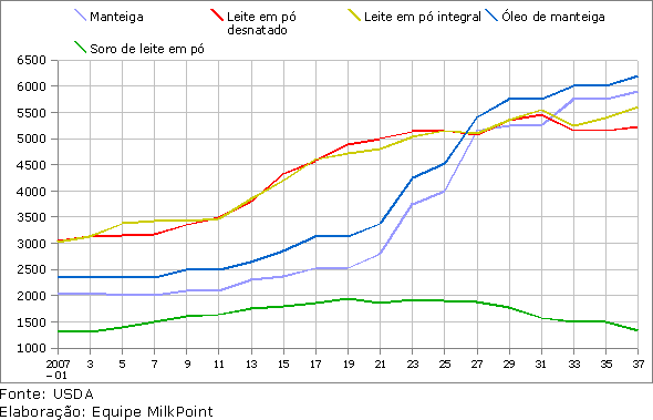 O óleo de manteiga exportado do Oeste da Europa atingiu novo recorde, sendo vendido entre US$ 5.900/t e US$ 6.500/t, representando um aumento médio de 3,3% frente à segunda quinzena de agosto. Os valores significam um acréscimo de 172% em relação ao mesmo período de 2006.